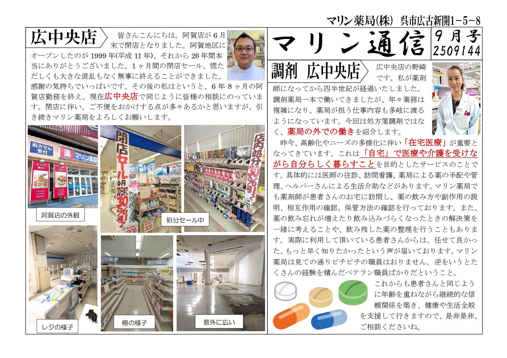 新着情報 News 2025/07/01新着情報マリン薬局阿賀店 閉店のお知らせ 2025/05/01新着情報今年度も「お仕事ブック」へ掲載されました! 2025/04/25新着情報マリンドラッグ阿賀店 ~営業時間・営業日変更のお知らせ~ 2024/04/09新着情報「お仕事ブック」への掲載のお知らせ 2024/02/02新着情報弊社社長 テレビ出演のお知らせ MORE