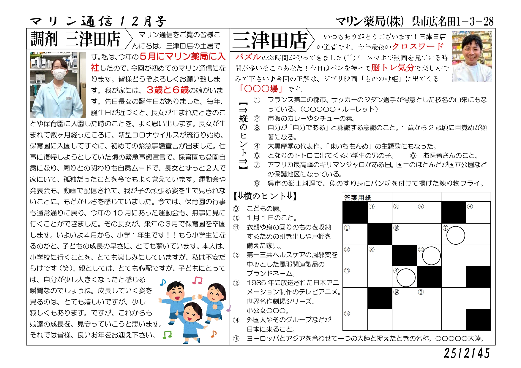 店舗情報 Store information マリン薬局 広中央店 Marine Pharmacy Hiro-chuuou マリン薬局 三津田店 Marine Pharmacy Mitsuta マリン薬局 広店 Marine Pharmacy Hiro マリン薬局 海岸通店 Marine Pharmacy Kaigandori マリン薬局 宇品店 Marine Pharmacy Ujina